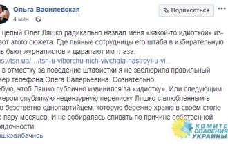Журналистка телеканала "1+1" Ольга Василевская потребовала от главы Радикальной партии Олега Ляшко извиниться за то, что он обозвал ее "какой-то идиоткой" за разглашение его персонального номера телефона.